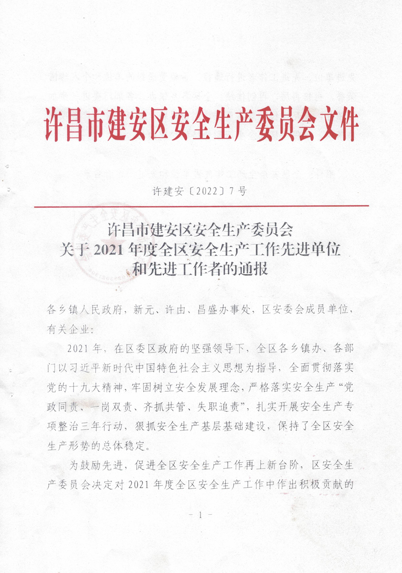 2021年,我公司以習近平新時代中國特色社會主義思想為指導,全面貫徹落實黨的十九大精神,牢固樹立安全發展理念,嚴格落實安全生產“黨政同責、一崗雙責、齊抓共管、失職追責”,狠抓安全生產基層基礎建設,排除潛在的安全隱患,保持了廠區安全生產形勢的總體穩定。故許昌市建安區安全生產委員會對我公司在2021年度安全生產工作中的積極貢獻進行了表彰,授予于“全區安全生產工作先進單位”稱號。
